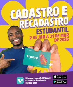 Ano novo, cartão “novo”! No primeiro dia útil de 2026, 02 de janeiro, será iniciado o período de cadastro e recadastro dos cartões Vamu Escolar, procedimento que assegura a utilização dos cartões destinados aos estudantes com o benefício do Passe Livre. Os dois procedimentos poderão ser realizados até o dia 31 de março.