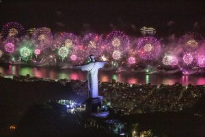 Cristo Redentor e a queima de fogos em Copacabana, na virada de 2021 para 2022 (Imagem: Fernando Maia/Riotur)
