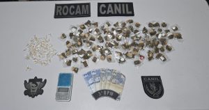 No interior dos recipientes foram encontrados 363 pinos de cocaína, 131 pedras de crack e a quantia de R$ 337,00. Os envolvidos e o material foram encaminhados à Central de Polícia Civil.