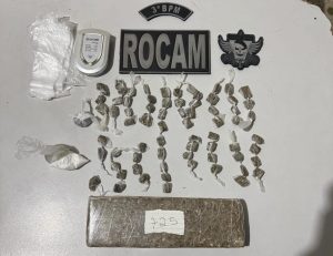 Após a revista, os militares constataram que a mochila continha um tablete de maconha pesando 720 gramas, 71 bombinhas da mesma substância totalizando 56 gramas, além de 22 gramas de cocaína e uma balança de precisão. O autor foi preso em flagrante.