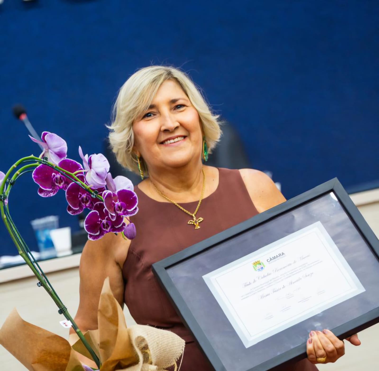 A homenageada agradeceu ao vereador Luciano Marinho, aos membros da Câmara, à família, aos amigos e aos colegas da educação, além de destacar sua atuação em trabalhos voluntários e em outras diversas ações. Ela dedicou a honraria a todos que caminharam ao seu lado na trajetória profissional.