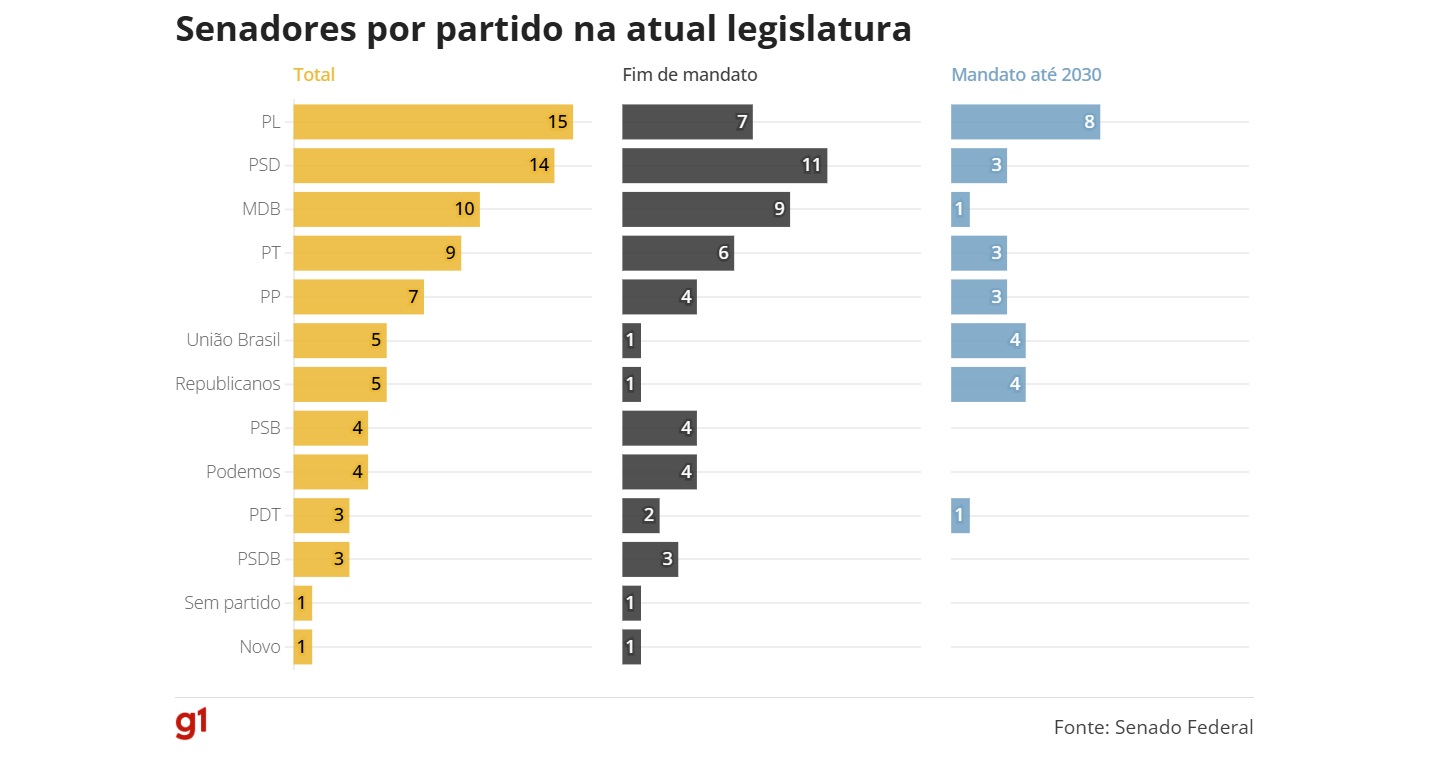 Republicanos e União Brasil manterão quatro senadores cada um. O PT tem três senadores ainda em meio de mandato, bem como PP e PSD.